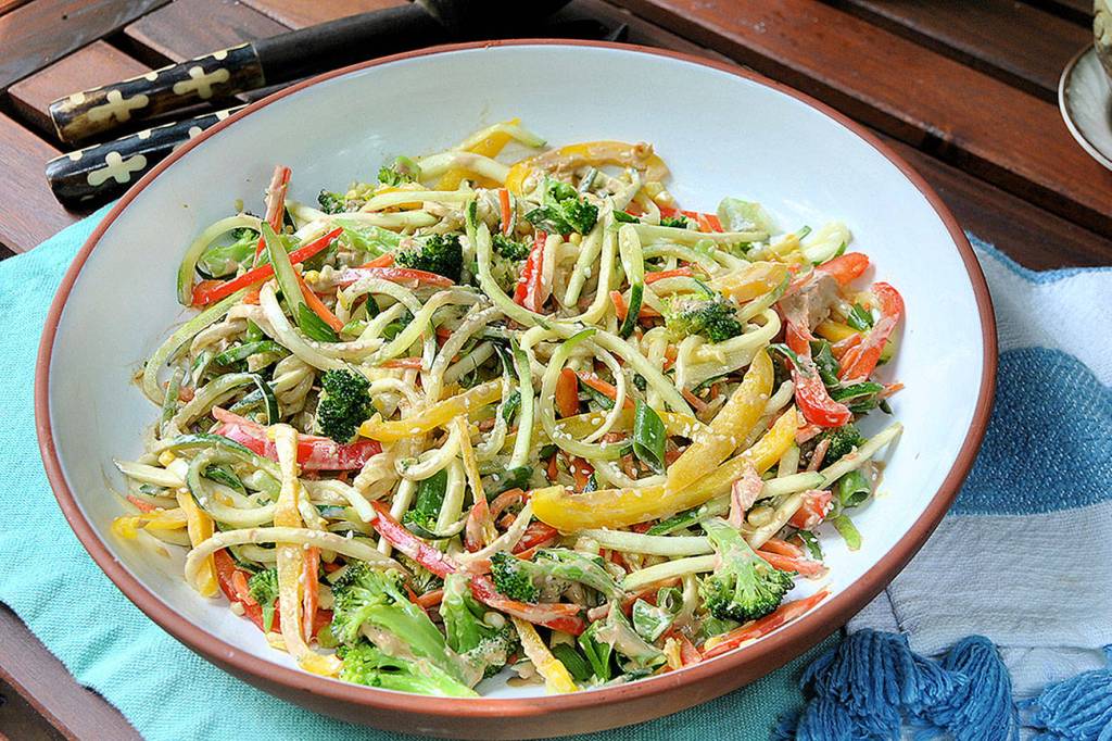 A zucchini noodle salad with an East Asian-inspired tahini-ginger dressing is an easy, low-carb summer dish. (Gretchen McKay/Pittsburgh Post-Gazette/TNS)