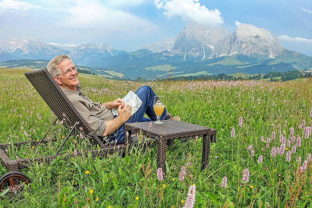 Leaning back in my lounge chair, I enjoy the heat of the sun on my skin. A vibrant sea spreads out before me, but it’s a sea of wildflowers. I’m not at the beach — I’m on a farm, looking out on Europe’s largest high alpine meadow, manicured by munching goats and cows. In the distance, stark snow-dusted peaks tower boldly against the blue sky. These are Italy’s Alps, the Dolomites.