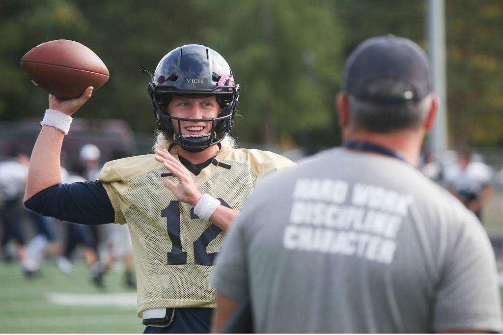 Trent Nobach throws a pass during practice Tuesday in Arlington. (Andy Bronson / The Herald)