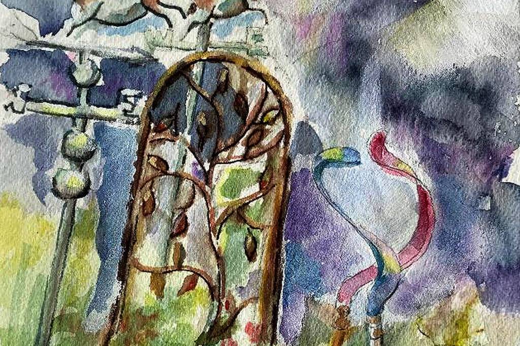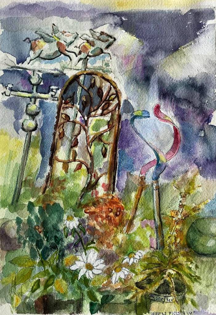 On another trip, Shefter painted a composition of garden art on display at Christiansen’s Nursery near La Conner.