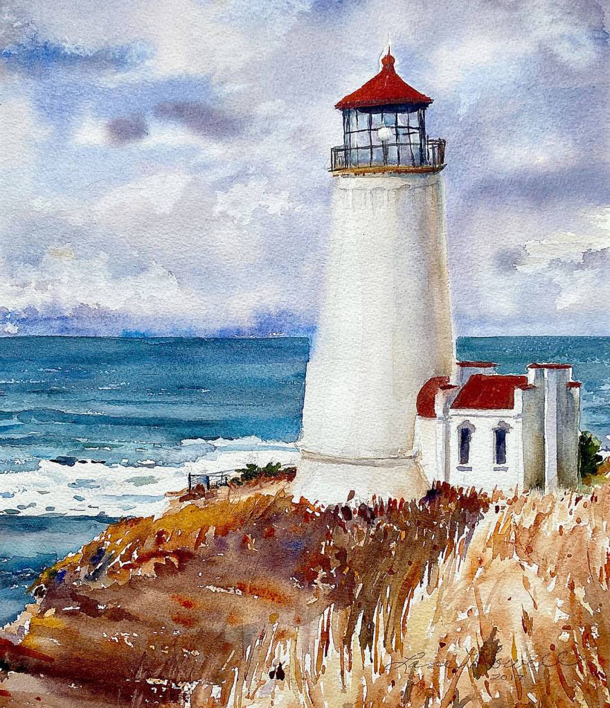 This year’s raffle prize is a painting by Lane Rowell titled “Lighthouse.” It’s a watercolor of the North Head Lighthouse at Cape Disappointment. The lighthouse was completed in 1898.