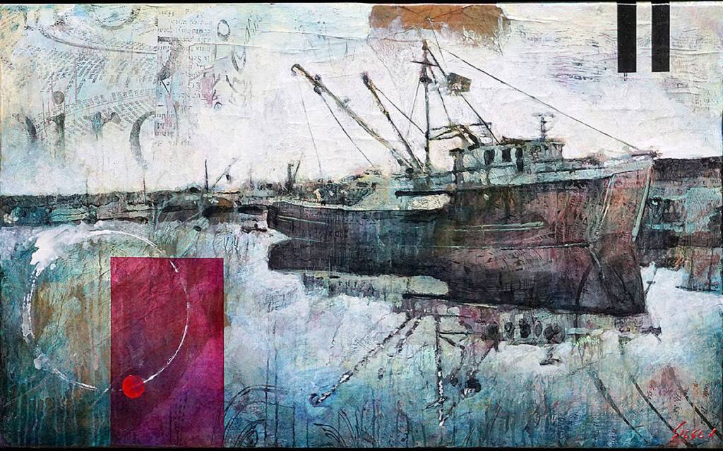 If you look closely at his paintings of birds, bridges and boats, you might find a few repetitive elements, like a white paint can ring or a red or black textbook bar. James throws these signature marks into paintings when the impulse strikes.