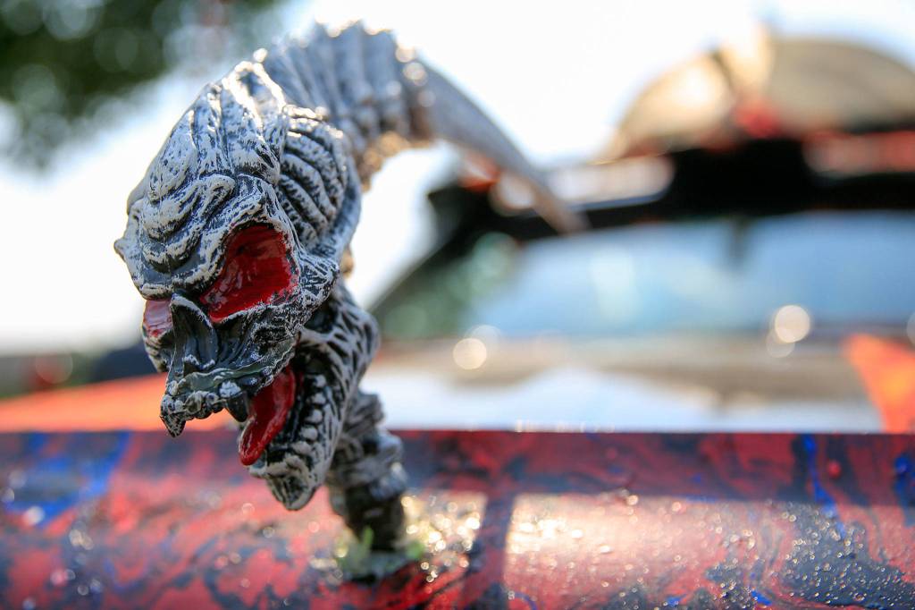 That’s where I saw the fiery truck with blue wheel spokes, metal studs and skull hood ornament. It stood out amid the gray, black and other vehicles factory-painted by robots.