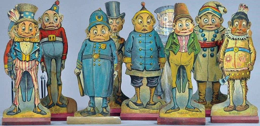 There were many different Brownies, all men. Each Brownie has a personality and trade, and was dressed appropriately for his job. You can see Uncle Sam, a policeman, Chinese man, Irish man, sailor, Indian, and even a man in a top hat among the figures in the game of ten pins. Each figure is 12 inches high, made of lithographed paper over wood. The object of the game is to knock down the pins. But all Brownies liked to make mischief. They were all good, strong and jokers. They traveled and did good deeds, but only harmless tricks with no damage. It was lucky to have a Brownie in the house even though you can’t see him.