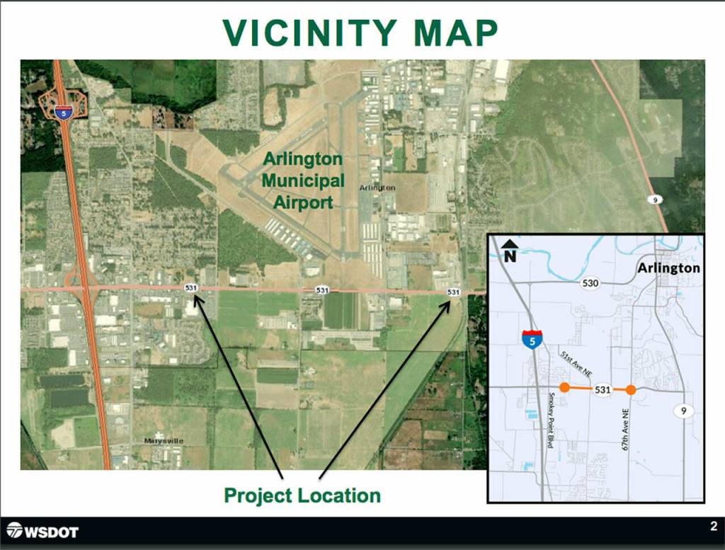 When work begins, the Department of Transportation will widen a two-mile stretch of Highway 531 from 43rd Avenue NE to 67th Avenue NE. Roundabouts are planned at 43rd, 51st, 59th and 67th avenues northeast.