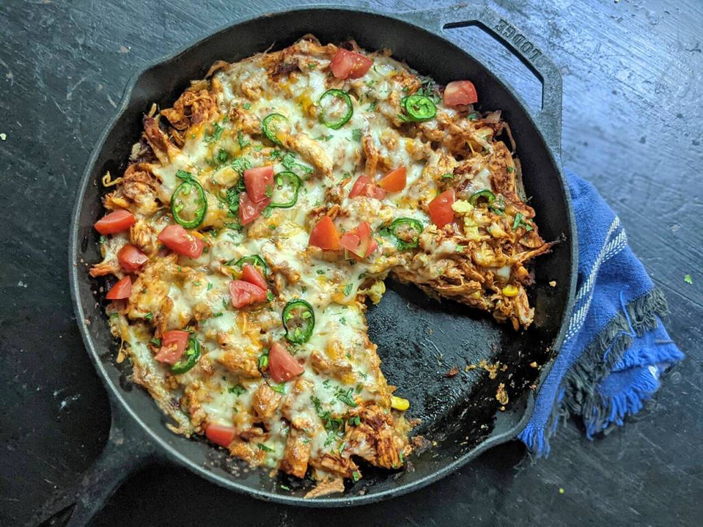 Mix half of the enchilada sauce with the shredded chicken. Pour the other half of the enchilada sauce over the top the cornbread, and smooth with a spoon or offset spatula. Top with shredded chicken and all the cheese.