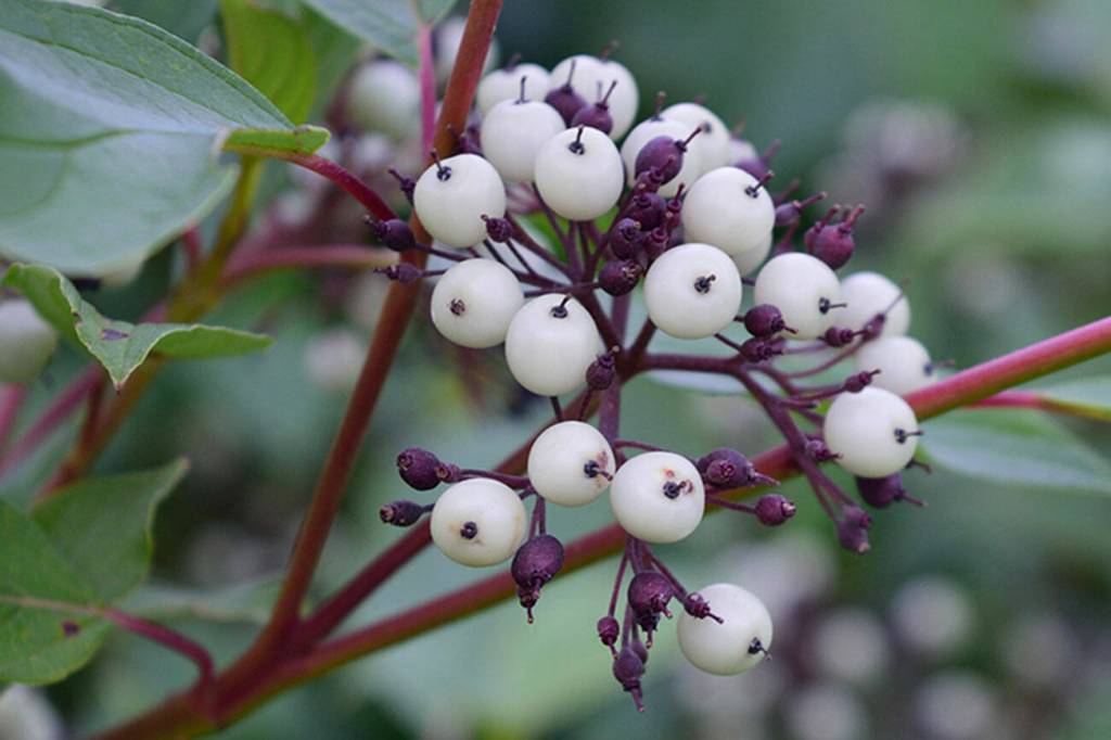 “Firedance”: According to Bailey Nursery, this new introduction is a “compact variety with white flowers in spring, followed by pretty white berries that are attractive to birds. It is tolerant of moist conditions and suitable for rain gardens. The foliage turns a nice red-purple color in fall, giving multi-season interest.” The leaves are solid green and the twigs turn a bright red in winter.