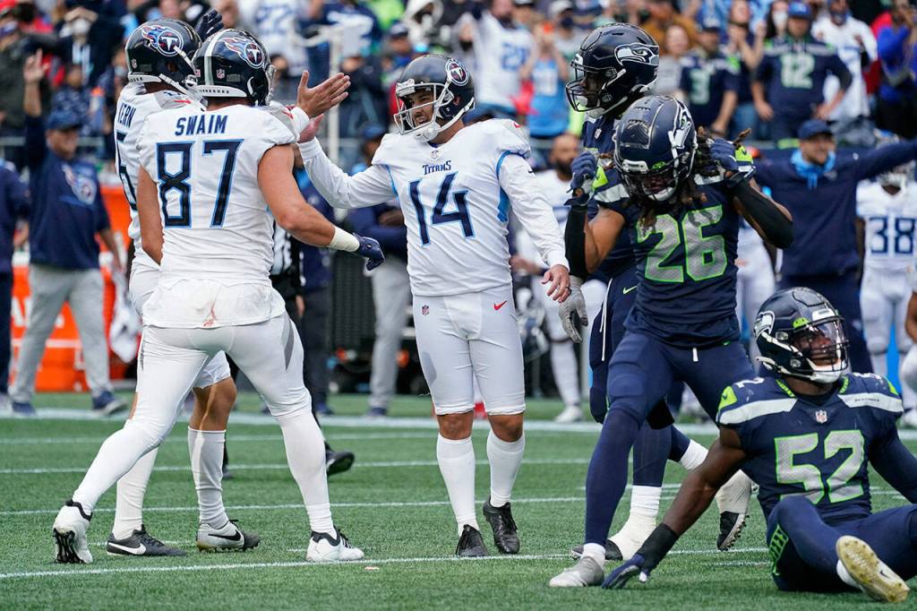 Tennessee Titans kicker Randy Bullock (14) celebrates with tight end Geoff Swaim (87) as Seattle Seahawks defensive back Ryan Neal (26) reacts after Bullock kicked a field goal in overtime to give the Titans a 33-30 win in an NFL football game, Sunday, Sept. 19, 2021, in Seattle. (AP Photo/Elaine Thompson)