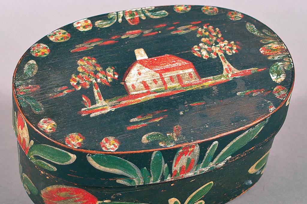 Heinrich Bucher, and eventually his sons, made and sold bentwood boxes decorated with yellow, green, red and white trees, tulips and other foliage on a black background. The boxes sell today for thousands of dollars. This box sold in a Conestoga auction for $4,260 after 26 bids. It had been estimated at only $1,000.