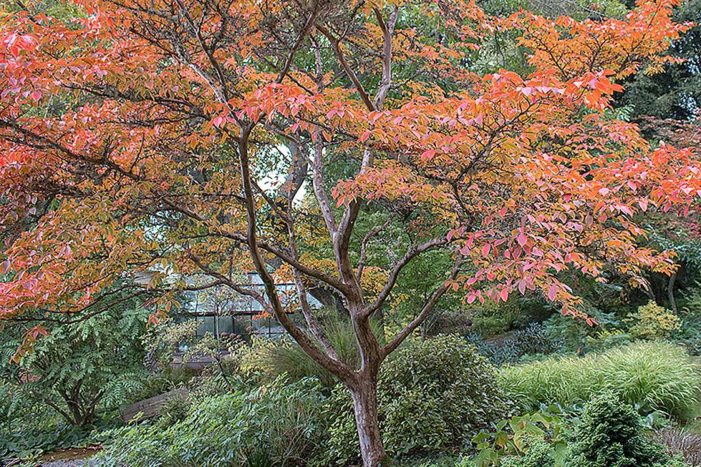 Japanese stewartia’s dark green leaves become a riot of saturated oranges and flaming reds in the fall. (Richie Steffen)