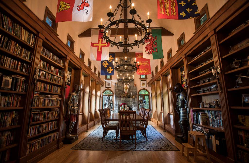 He went gung-ho curating the great hall with artifacts. Flags hang from the high cathedral ceilings. On the shelves, thousands of sci-fi and fantasy books, along with swords, knives and axes.