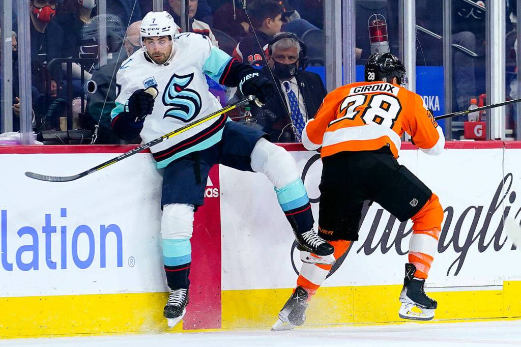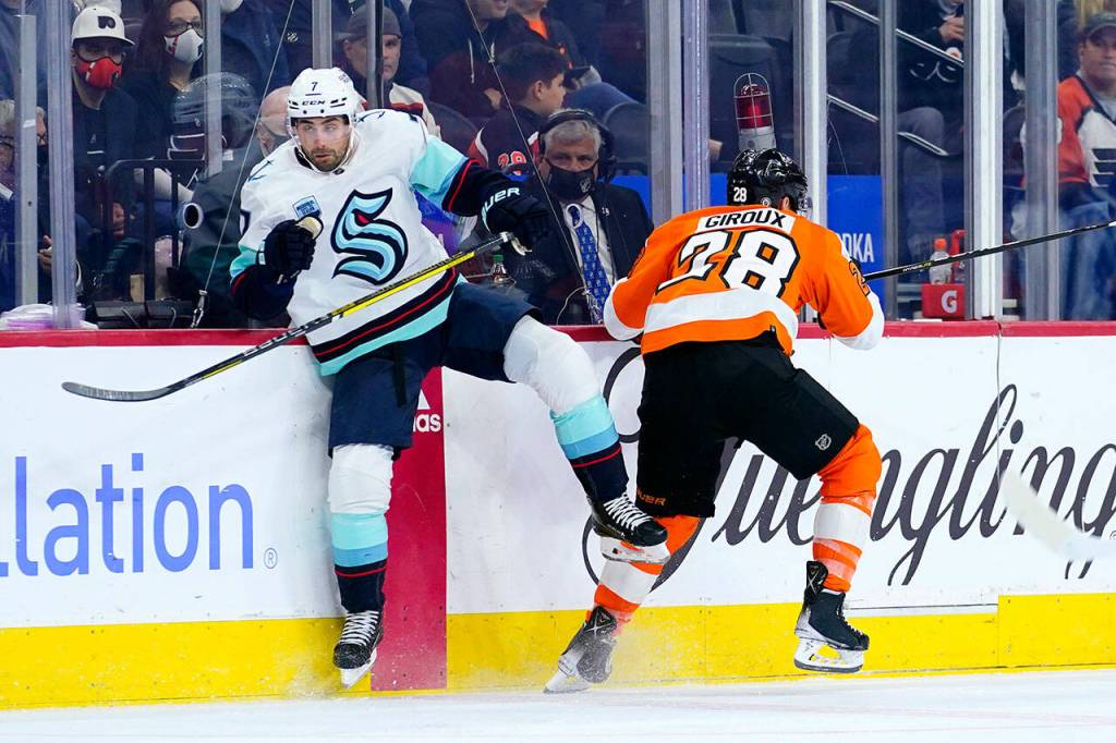 PHILADELPHIA — Claude Giroux and Travis Konecny scored, former Everett Silvertip Carter Hart stopped 24 shots and the Flyers spoiled former coach Dave Hakstol’s return to Philadelphia with a 6-1 win over the Seattle Kraken on Monday night.