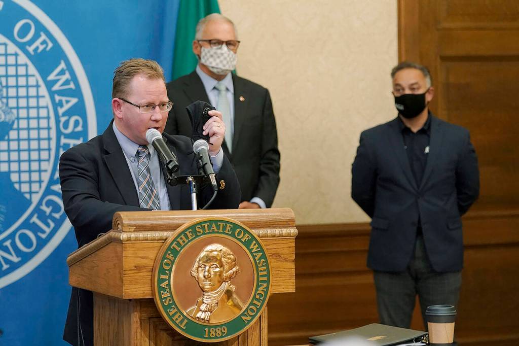 Washington State Superintendent of Public Instruction Chris Reykdal (left) holds up a face mask as he speaks at a news conference, along with Gov. Jay Inslee (center) and Secretary of Health Umair A. Shah (right), at the Capitol on Aug. 18 in Olympia. (AP Photo/Ted S. Warren file)