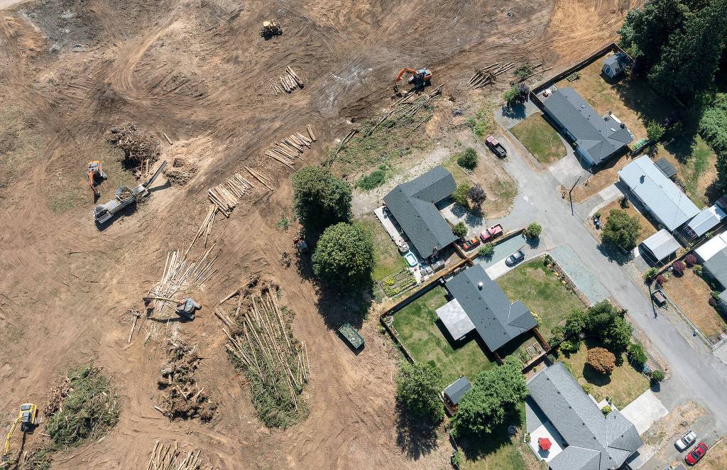 A group is suing the Army Corps of Engineers, alleging the planned construction of a Costco warehouse in Lake Stevens will violate the Clean Water Act. This Aug. 10 aerial photo was taken after thousands of trees were removed near homes at the end of the 2100 block of 93rd Drive SE. (Chuck Taylor / Herald file)