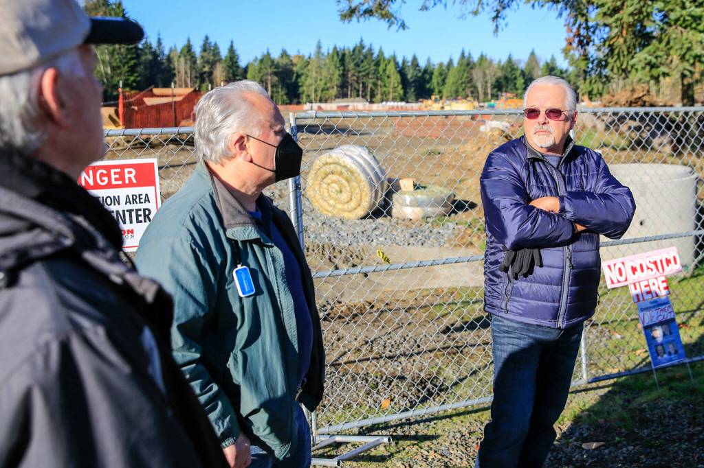 Members of the Livable Lake Stevens, Charles Allen, left to right, David Clay and Doug Turner at the construction of Costco in Lake Stevens on October 31, 2021. (Kevin Clark / The Herald)