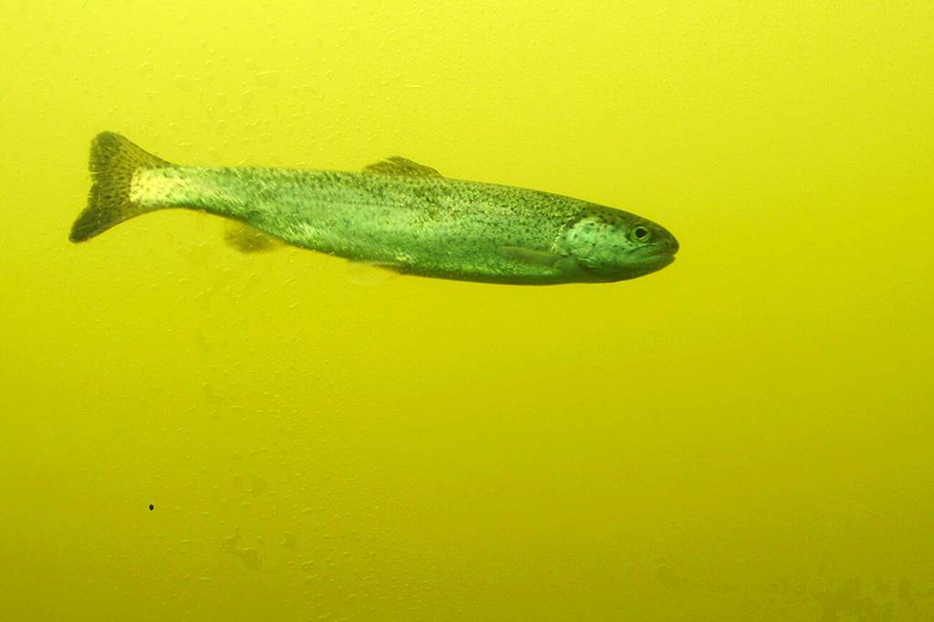 A smolt is seen in a viewing window at the visitors center of the Lower Granite Dam on the Snake River near Almota, Wash., in April, 2018. (Nicholas K. Geranios / Associated Press)