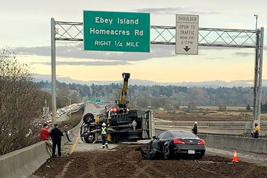 EVERETT — A dump truck rolled over Saturday afternoon on the U.S. 2 trestle just east of Everett, spilling dirt and rocks across the road and blocking all eastbound lanes of traffic.