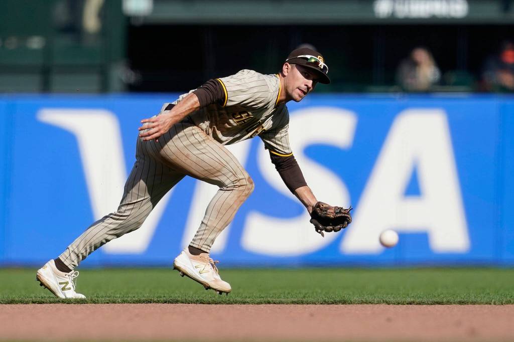 Padres second baseman Adam Frazier field the ball during a baseball game against the Giants on Sept. 16, 2021, in San Francisco. The Mariners acquired the All-Star second baseman from the Padres in exchange for two minor-leaguers on Saturday. (AP Photo/Jeff Chiu)