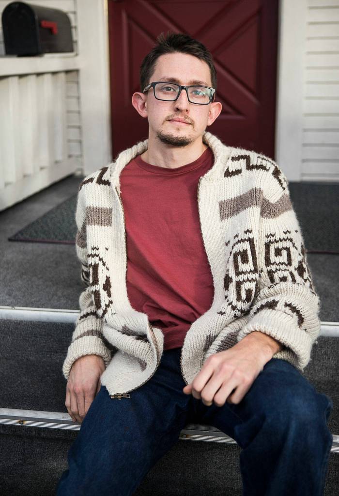 Jacob Akers in his replica Dude sweater from The Big Leboswki on Tuesday, Nov. 23, 2021 in Everett, Wa. (Olivia Vanni / The Herald)