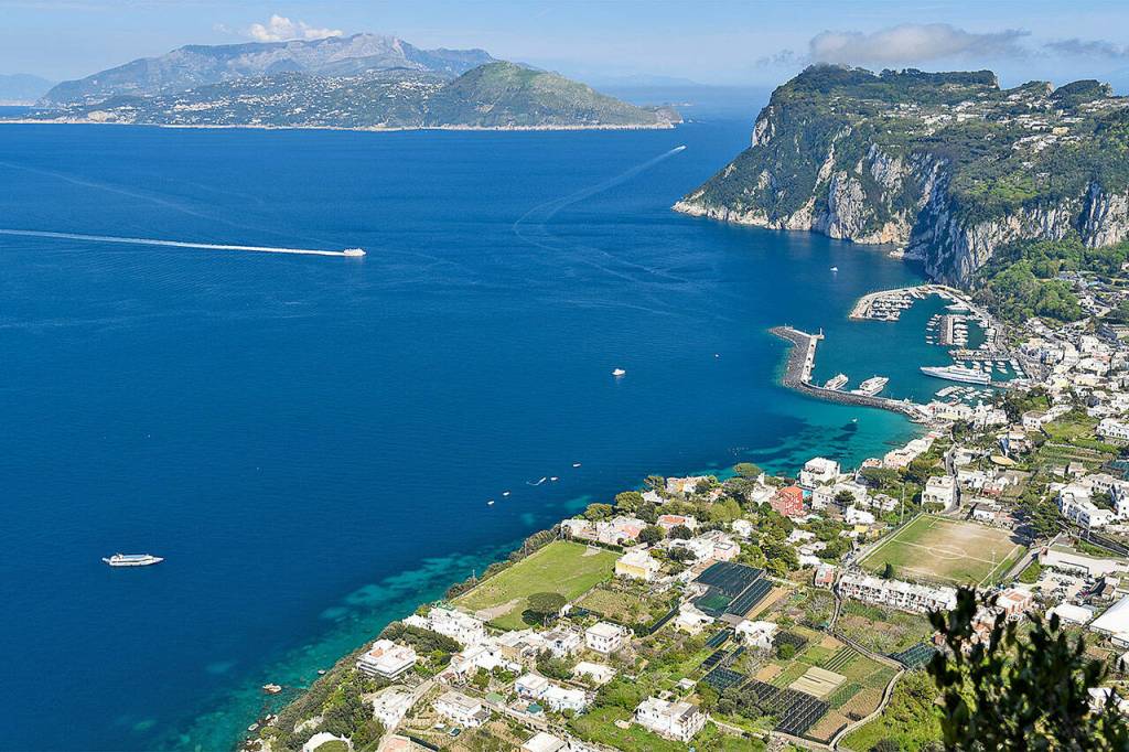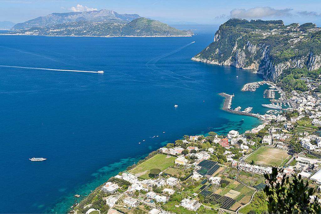 Today, Capri is expensive and glitzy — and a world-class tourist trap. Landing on the island, I’m met with a greedy line of white convertible taxis, eager to sweep me away. Zigzagging up the cliff with the top down, I think that despite its crowds and commercialism, Capri is still flat-out gorgeous. Chalky white limestone cliffs rocket boldly from the shimmering blue and green surf. Strategically positioned gardens, villas and viewpoints provide stunning vistas of the Sorrentine peninsula, Amalfi Coast and Mount Vesuvius.