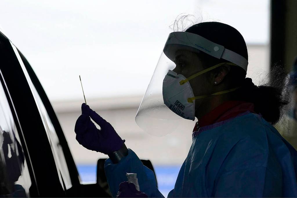 In this 2020 photo, University of Washington research coordinator Rhoshni Prabhu holds up a swab after testing a passenger at a free COVID testing site in Seattle. (AP Photo/Elaine Thompson, file)