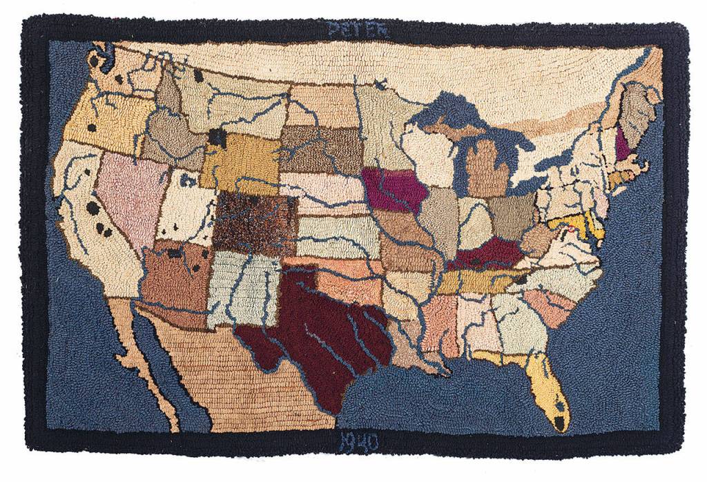 By 1940, rug making had become an art form, not just a job for the poor. Artists and amateurs made hooked rugs to use or sell. This hooked rug pictures a map of the United States. On the back it reads, “For Peter Stone on his 5th birthday Nov. 10, 1940, with Carlo’s love.” Perfect provenance. It sold at a Cowan’s auction for $469.