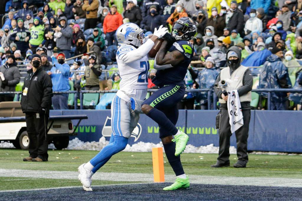 Seattle Seahawks wide receiver DK Metcalf, right, makes a catch for a touchdown in front of Detroit Lions cornerback Ifeatu Melifonwu, left, during the second half of an NFL football game, Sunday, Jan. 2, 2022, in Seattle. (AP Photo/John Froschauer)