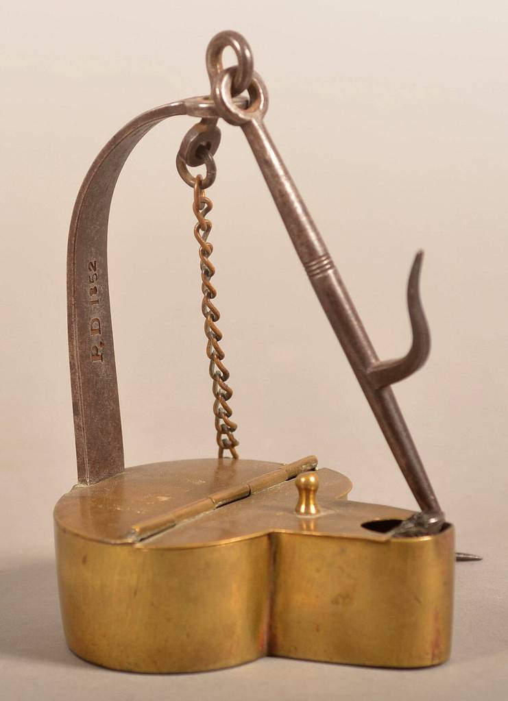 The Betty lamp is one of the earliest portable light sources. It usually is made of brass or iron. The bottom layer is a pan that shapes to a point: the spout. A second pan is on top to hold the wick, usually a twisted piece of fabric placed in the spout to soak up some fuel. The wick is lit to produce a flame. The lamp also has a hook so it can be hung on a wall. Sometimes they have a third layer: a cover to keep bugs out.
