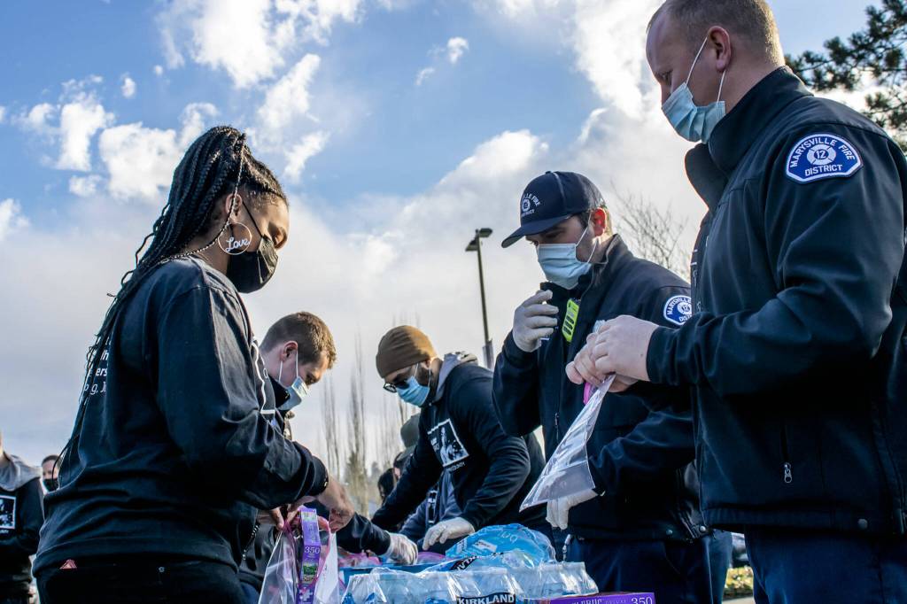 In the 40-degree fog outside the YMCA building, students from Marysville Pilchuck and Marysville Getchell high schools, leaders from LINC Northwest’s family resource hub, Marysville YMCA staff and Marysville Fire District personnel assembled care packages for seniors, survivors of domestic violence and those experiencing housing insecurity.
