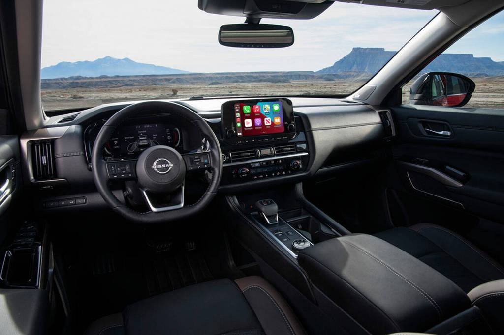 Pathfinder’s interior is a nice blend of contemporary styling, comfort and quiet, tech abundance, and truck ruggedness. Useful and well-designed stowage places are everywhere, including long and wide door pockets, a deep center console bin, an integrated tray in the lower dash, and a big open space beneath the bridge-style console.