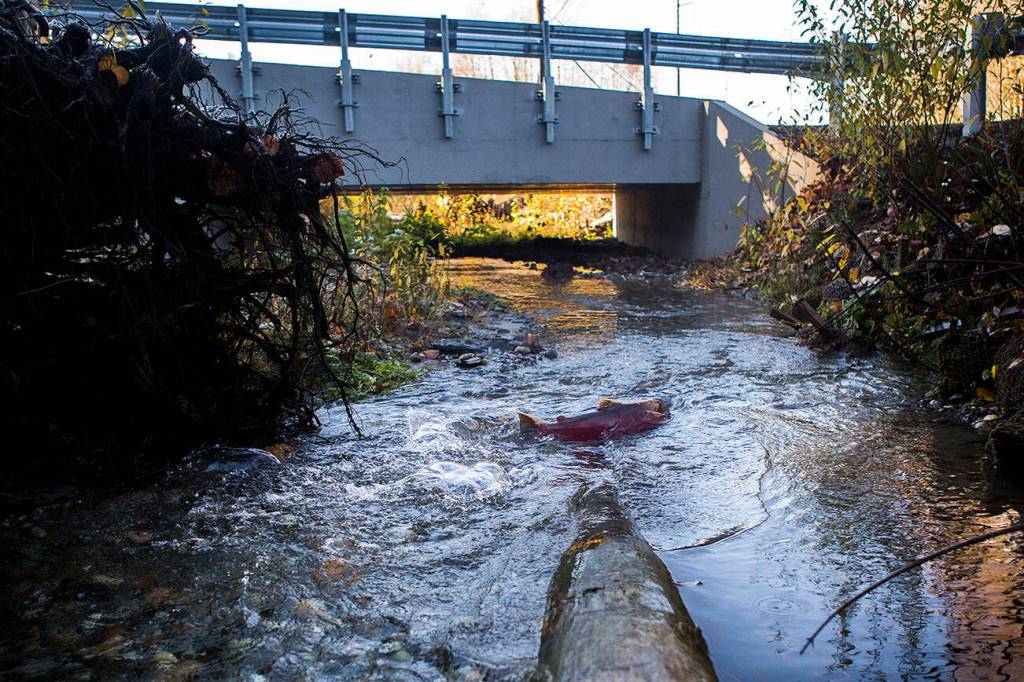 A Coho makes its way along Edgecomb Creek in Arlington in 2018, under a culvert built specifically to make it easier for the spawning fish to navigate the waterway. (Olivia Vanni / Herald file)