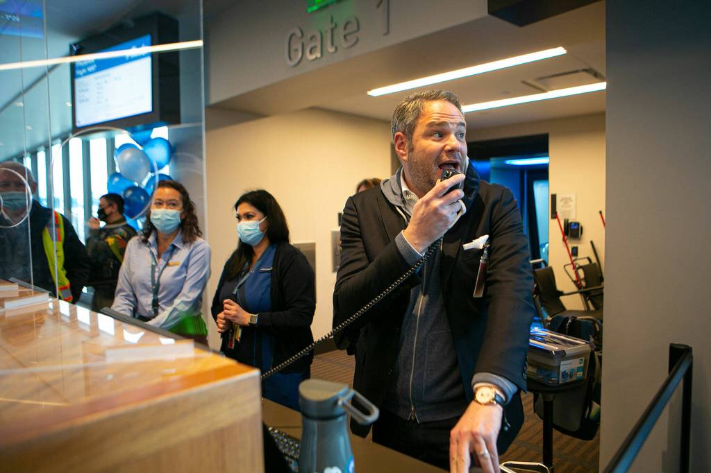Brett Smith, CEO of Propeller Airports, makes an announcement after the arrival of the first Alaska Airlines Boeing 737 flight Thursday at Paine Field in Everett. (Ryan Berry / The Herald)