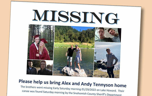 Family and friends identified the deceased as Andrew Tennyson, 21, and Alexander Tennyson, 19. They had gone canoeing around 12:30 a.m. on Jan. 29, on the lake south of Stanwood, according to the Snohomish County Sheriff’s Office.