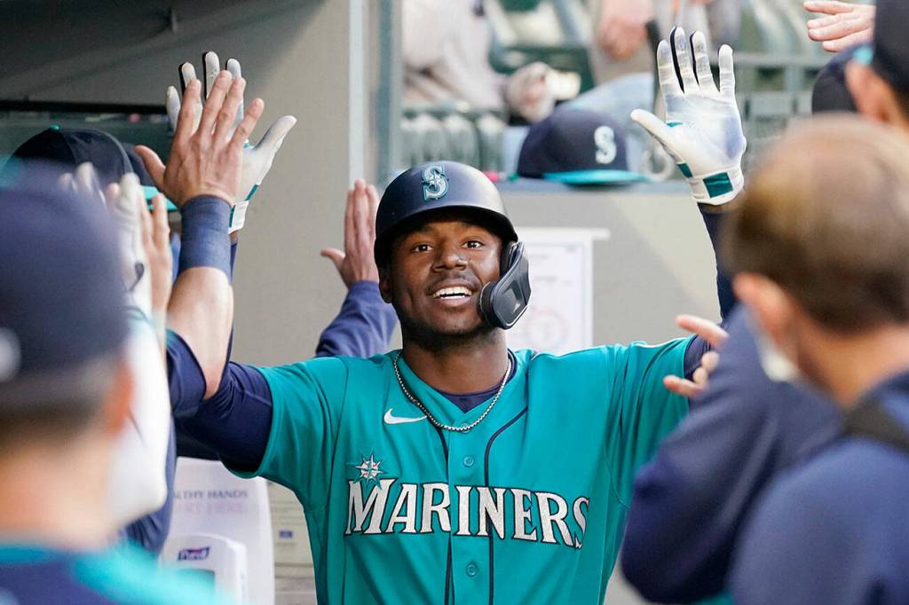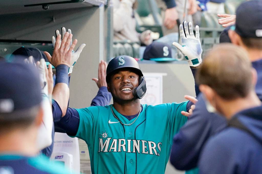Seattle Mariners’ Kyle Lewis is congratulated after his two-run home run against the Texas Rangers in the third inning of a game May 28, 2021, in Seattle. (AP Photo/Elaine Thompson)