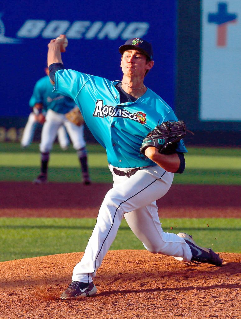 Seattle Mariners pitching prospect Emerson Hancock throws a pitch while playing for the Everett AquaSox during a game June 3, 2021, at Funko Field in Everett. (Kevin Clark / The Herald)