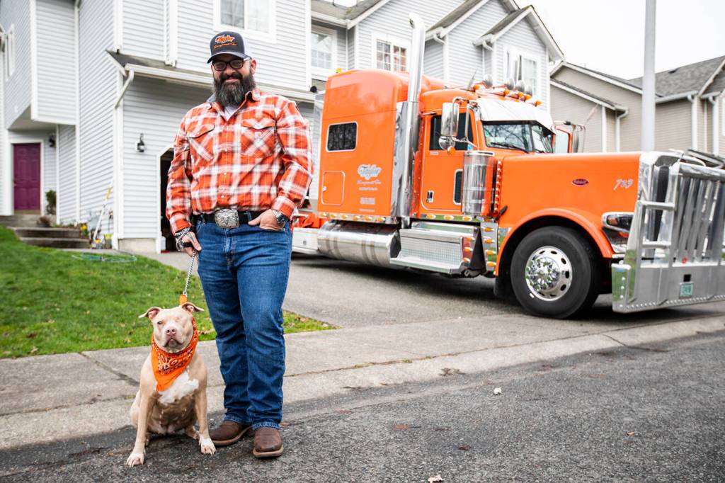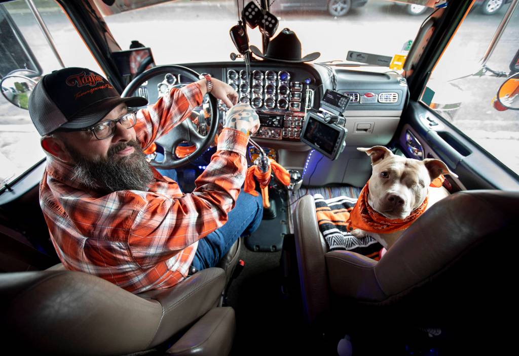 Shawn Dirksen, 45, a cigar-smoking, TikToking Lake Stevens flatbed truck driver, travels coast-to-coast with his rescue pitbull, Bonnie.