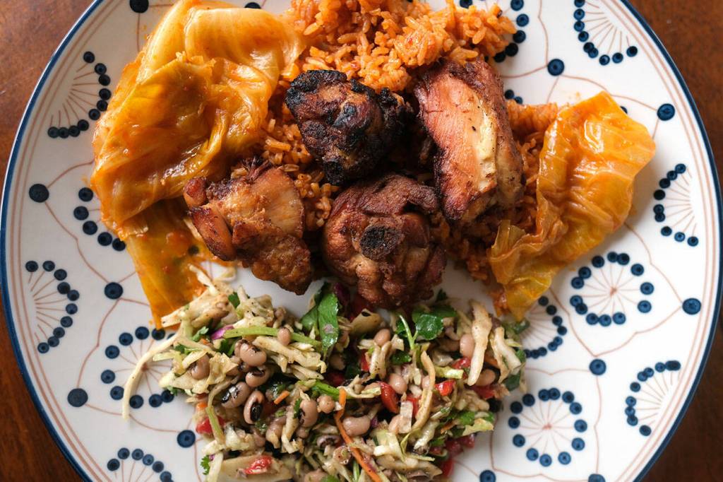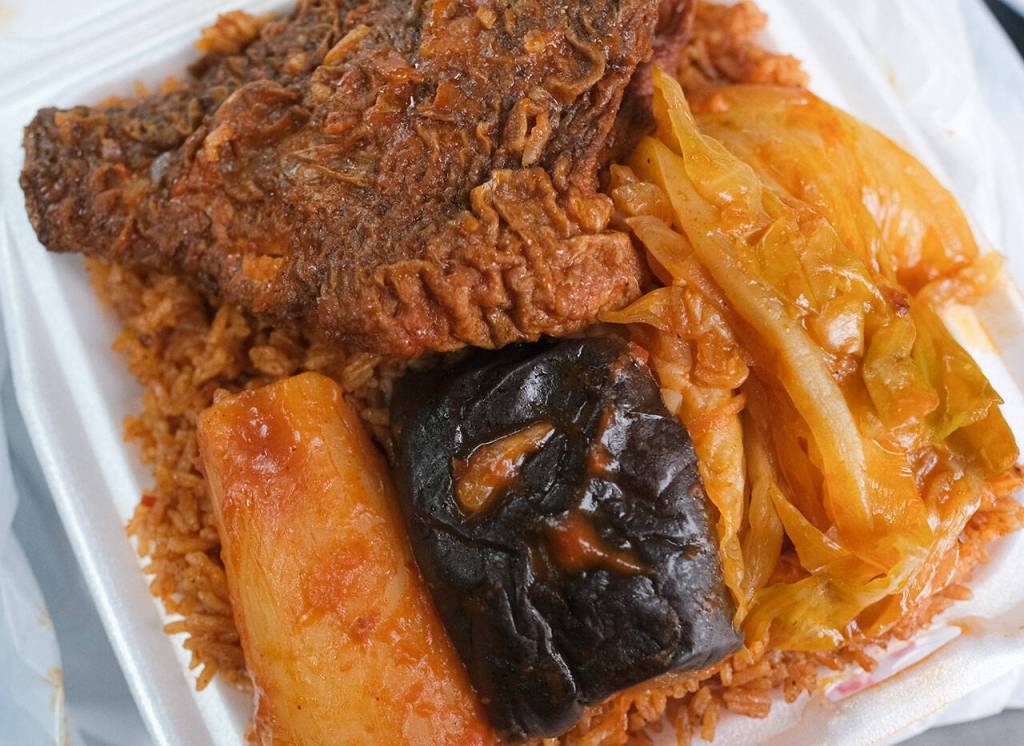 The Lynnwood counter-service eatery serves up West African dishes. Many appear vibrant red and orange from an exuberant use of tomato, chili, curry powder and other spices. These flavors soak into the meat, the rice, the meltingly-tender vegetables like cabbage and eggplant.