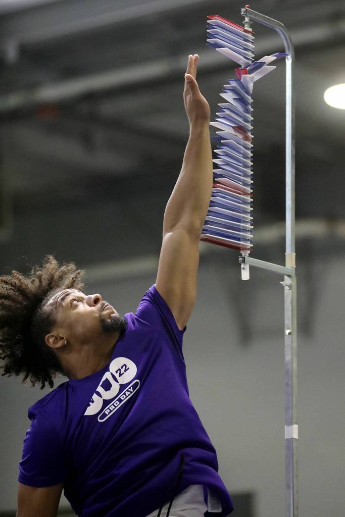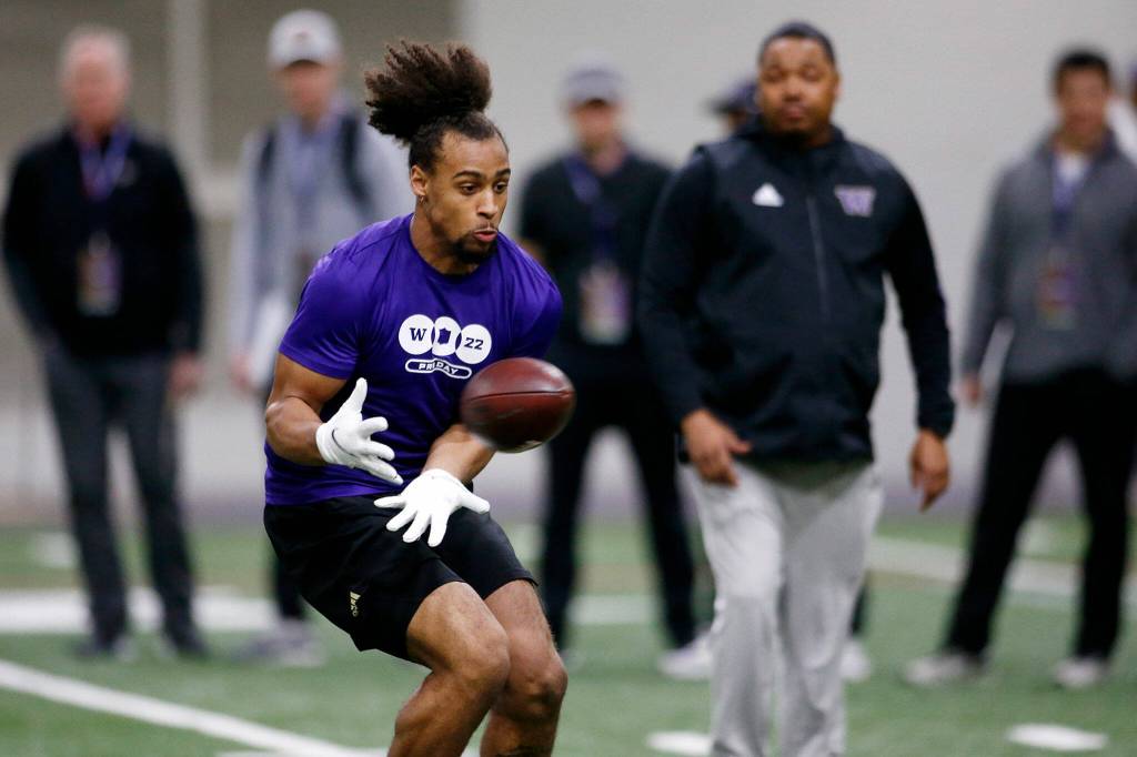 Defensive backs Trent McDuffie, Kyler Gordon and Brendan Radley-Hiles, running backs Sean McGrew and Kamari Pleasant, offensive lineman Luke Wattenberg, outside linebacker Ryan Bowman, tight end Cade Otton, punter Race Porter, quarterback Patrick O’Brien and former wide receiver Quinten Pounds all participated to some degree in Tuesday’s pro day. (Idaho State wide receiver and Kent native Tanner Conner participated as well.)