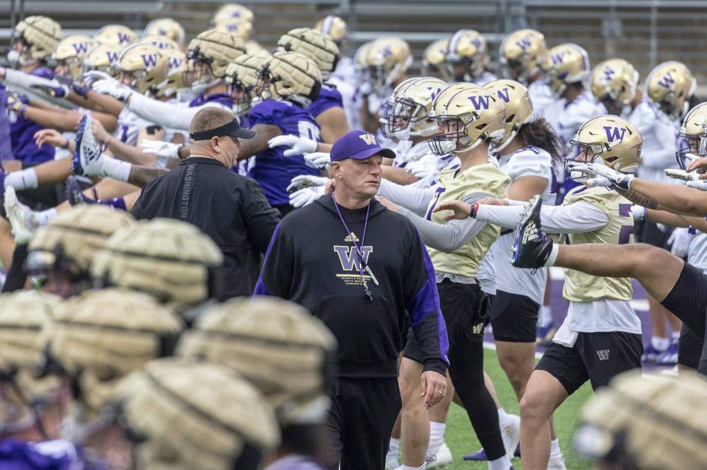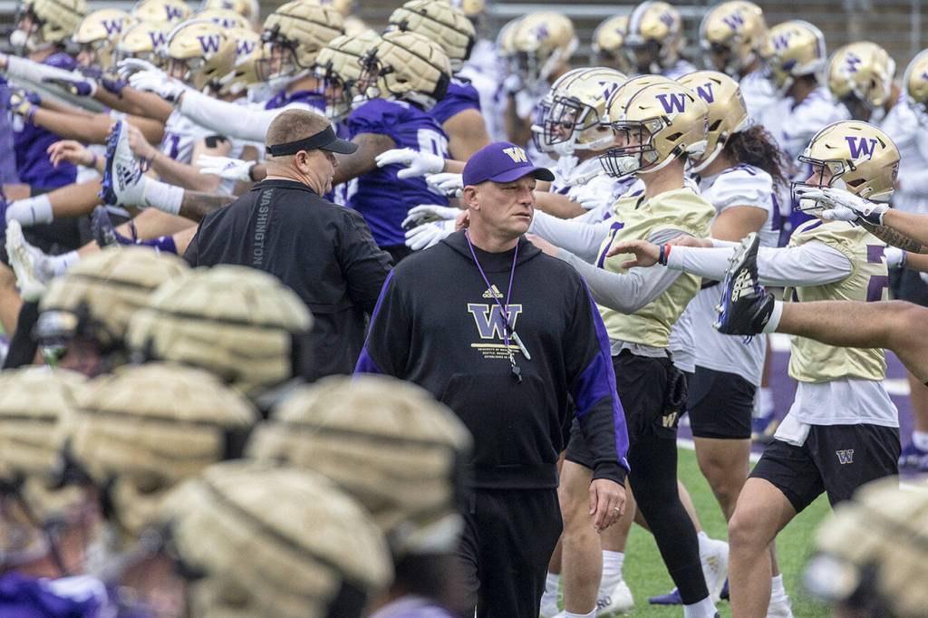 UW completed its first spring practice of the Kalen DeBoer era inside Husky Stadium Wednesday, working for roughly two hours in jerseys and shorts.
