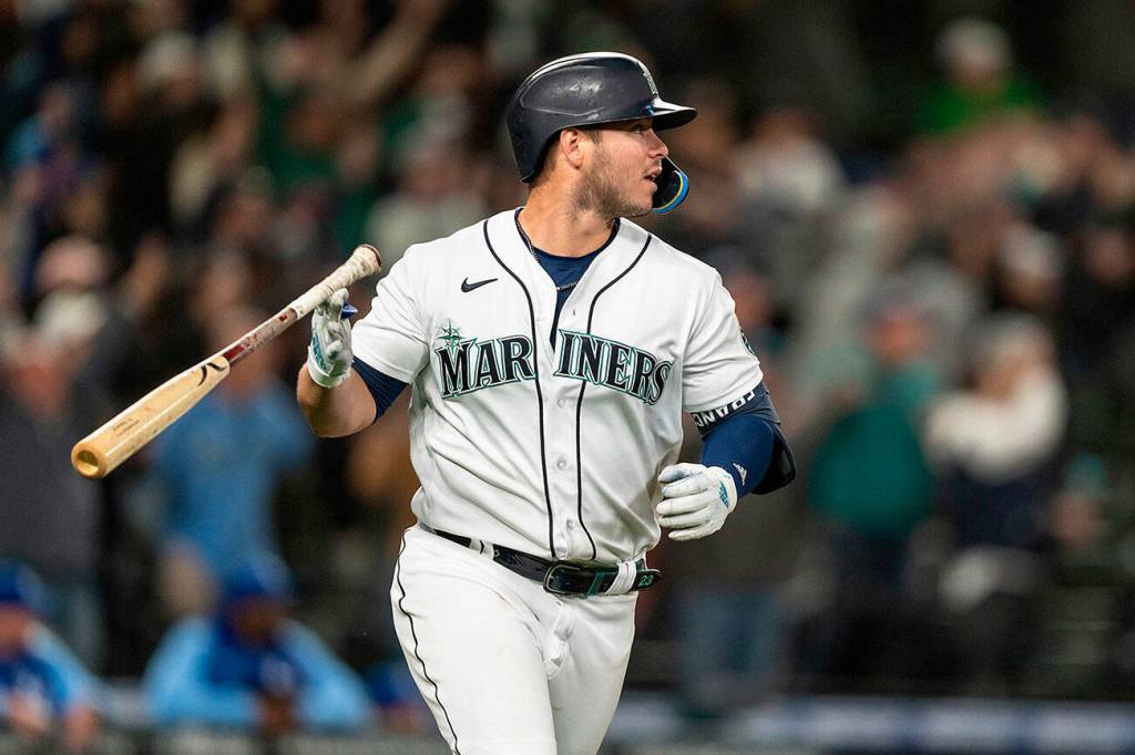 The Mariners’ Ty France flips his bat after hitting a three-run home run during the eighth inning of a game against the Royals on Saturday in Seattle. The Mariners won 13-7. (AP Photo/Stephen Brashear)