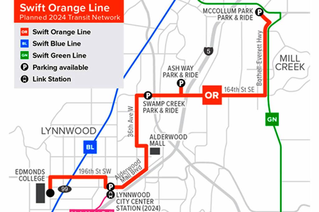 That level of interest is owed to what the Orange line — like the Blue and Green lines before it — represents: As described by Community Transit Chief Executive Ric Ilgenfritz, it’s 11 miles, 13 stops and 15 buses offering service 10 minutes apart between the McCollum Park Park-and-Ride and Edmonds College, with a connection at Lynnwood City Center to Sound Transit’s Link light rail service, both scheduled to begin service in 2024.