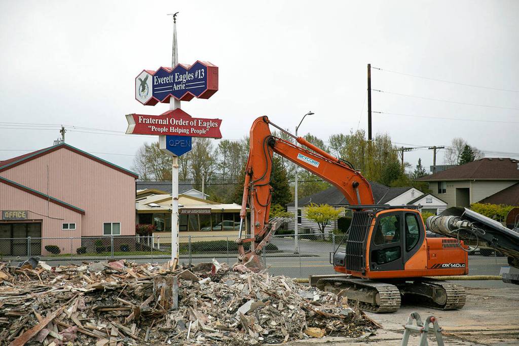 The Fraternal Order of the Eagles sign spins in the wind as demolition of the building at 1216 Broadway continues April 20 in Everett. The property was purchased by Everett Community College in 2020. (Ryan Berry / The Herald)
