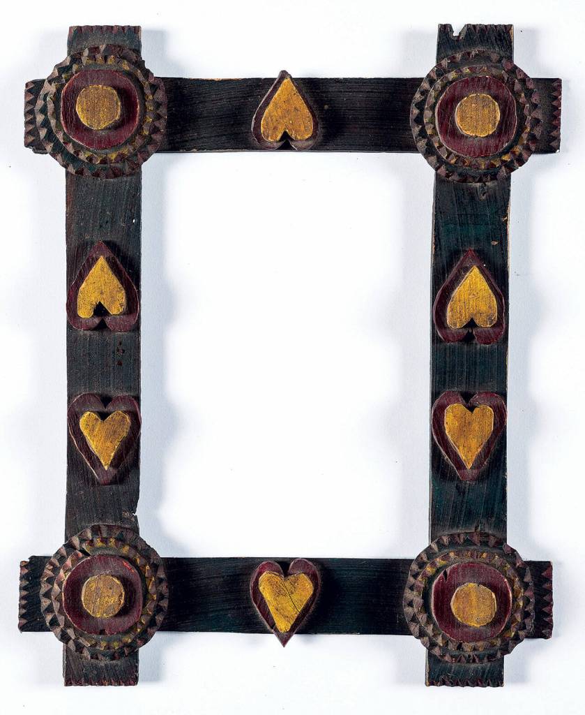 The most heartfelt things are made by hand. This picture frame can surround a loved one with colorful hearts. It’s an example of American folk art known as “tramp art.”