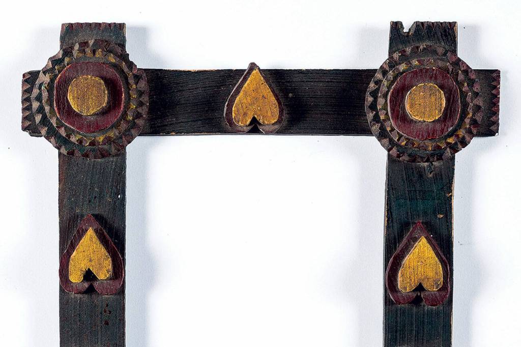 This frame, which brought $315 at a Pook & Pook auction, is unusual. The characteristic notches can be seen around the circles in the corners and on the exposed ends of the wood pieces, but the frame also features smooth-edged hearts painted red and yellow.