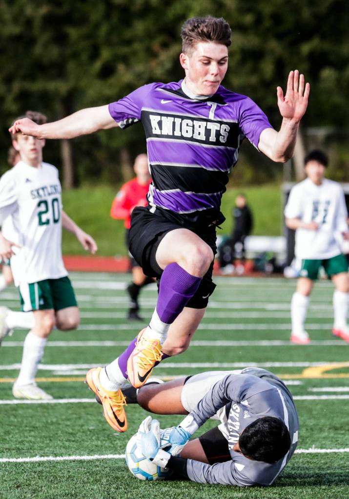 Kamiak was every bit Skyline’s equal during the first half. While the Spartans had more of the possession and forced eight corner kicks, the Knights had the better scoring chances, including Aidan Drought thundering a 25-yard free kick off the crossbar in the 23rd minute. Kamiak deservingly took the lead a minute later when Drought clipped a pass over the Skyline defense into the path of Pehlivanian sprinting through the right channel. Pehlivanian powered a low shot into the far corner to give the Knights a 1-0 lead.