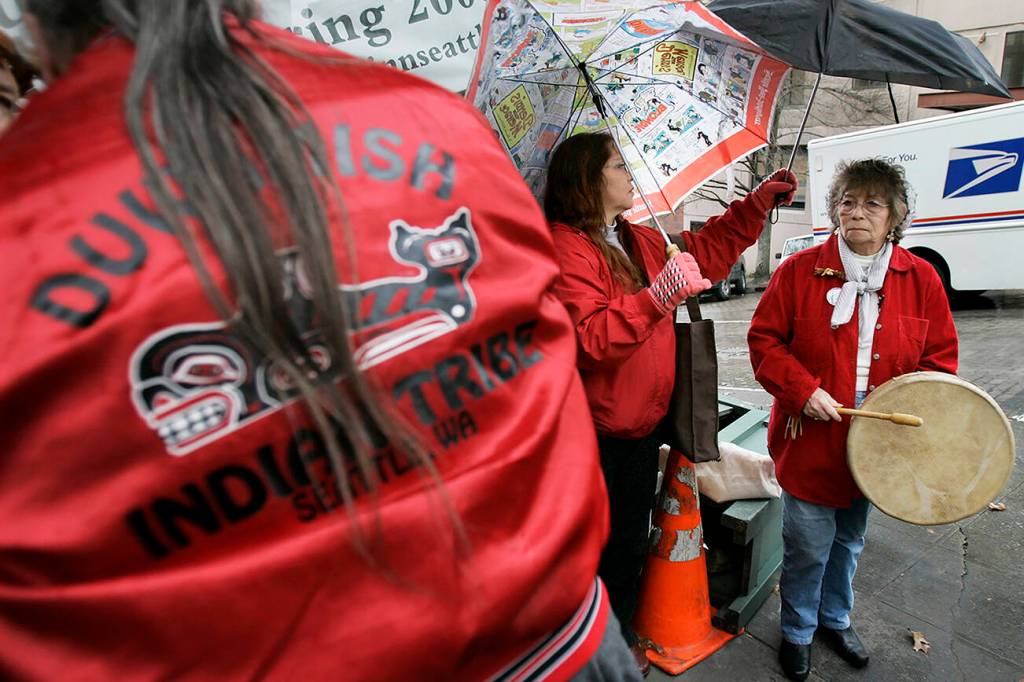 Barbara Williams, center, holds an umbrella for her mother, tribal chair Cecile Hansen, right, as they prepare to join other members of the Duwamish Indian Tribe in performing an "honor song" Wednesday, Feb. 27, 2008 near a location in Seattle where bones were found during construction activities near the Pike Place Market. The song was performed because the tribe felt at the time that the remains could have been from an ancient member of the tribe, but city authorities said later in the day that the remains appeared to have been from a small animal. (AP Photo/Ted S. Warren)