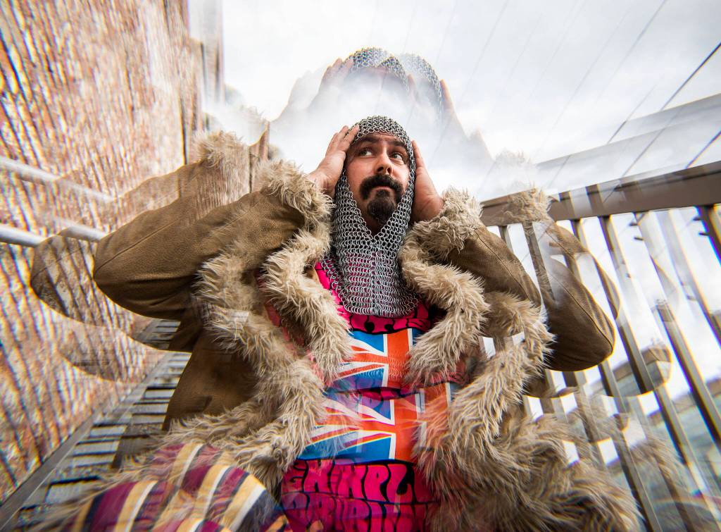 He jogs back to his minivan to get a chain mail coif. He wears costumes at home, too. His 5-year-old kid will eventually figure out that most families aren’t like this.