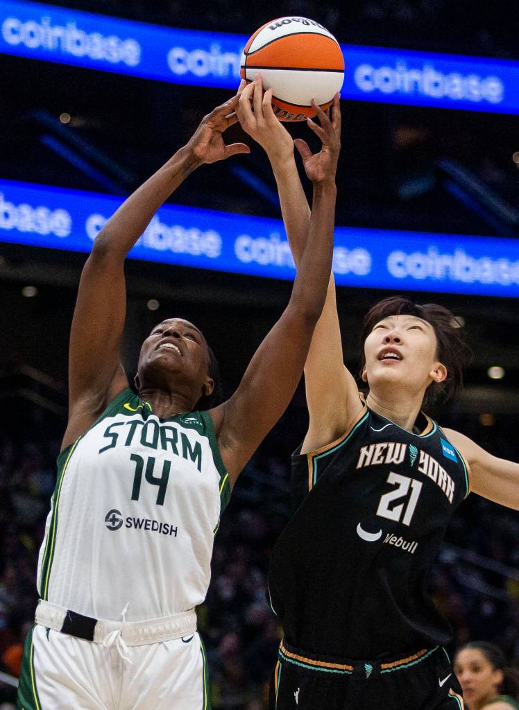 Seattle’s Jantel Lavender battles Liberty’s Han Xu for the ball during the game Sunday in Seattle. The Seattle Storm beat the New York Liberty 92-61, with Lavender having a double-double. (Olivia Vanni / The Herald)