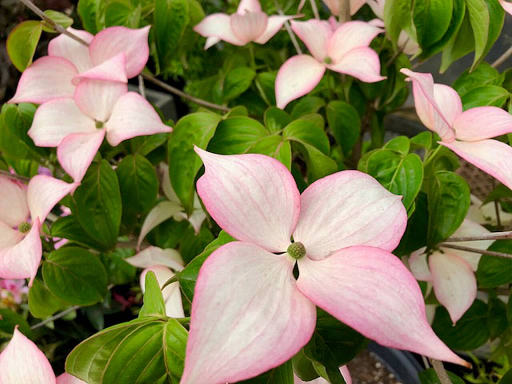 Finally, in the month of June, the Korean dogwoods, Cornus kousa, come into bloom. They are a slightly larger tree with more of a rounded form and can also bloom in either white or shades of pink, like the eastern varieties.
