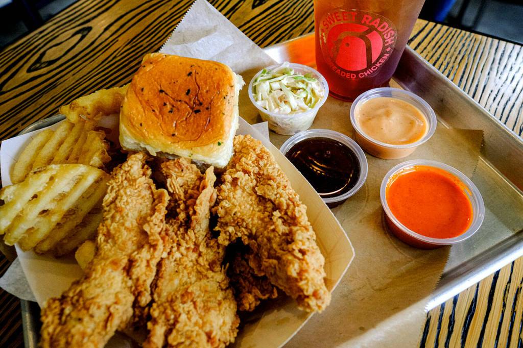 Pricing: Chicken plate combos come with two sides and sauces and cost between $10 and $15, with a choice of strips, spicy thighs or wings. Sandwich and burger combos come with fries and sauces and are priced between $10 and $12. You can also get any of the above without sides for a lower price. Go big with Sweet Radish’s platters: You can order strips, thighs, wings or any sides, from a small bowl of macaroni for $7.50, to a 50-piece chicken strip platter (feeds 10 to 13 people) for $89.50.